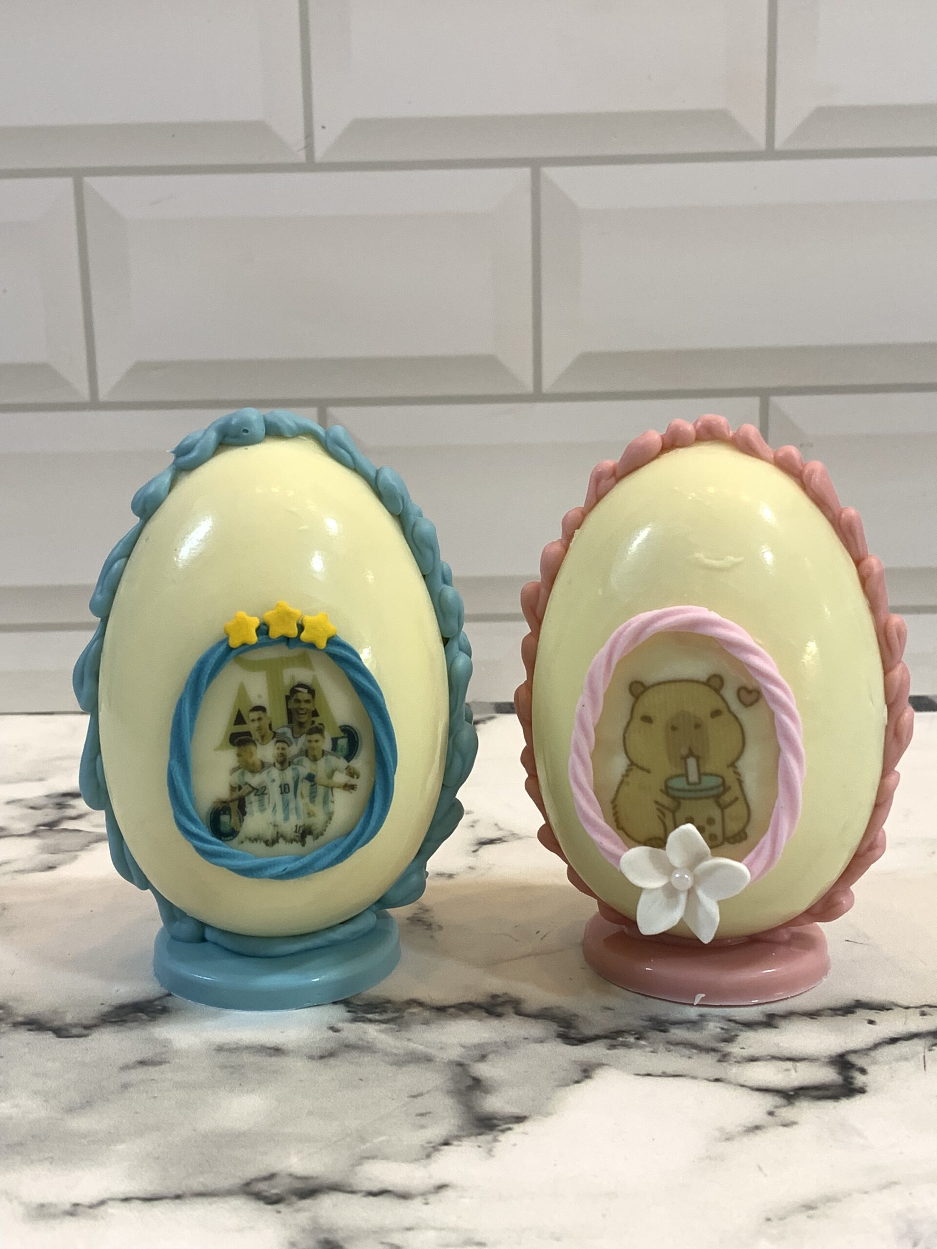 Box familiar de pascuas, cuenta con 4 huevos de chocolate blanco coloreados en colores a elección de 60grs cada uno. Estan rellenos con confites de chocolate y envueltos en bosas transparentes.